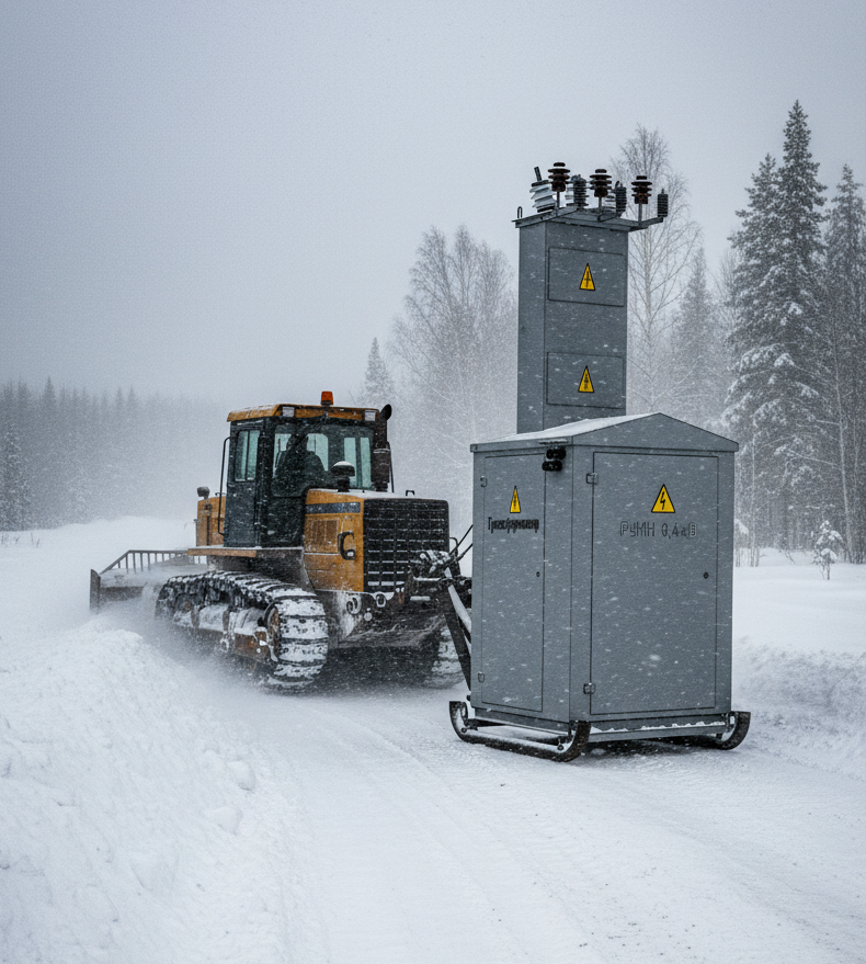 - Волочение: Если кран не может подъехать непосредственно к месту установки (например, в грунт или по временным дорогам), КТП можно аккуратно перемещать волоком, используя салазки как полозья, не повреждая при этом основной корпус.
